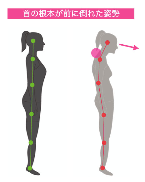 猫背になると図の丸で示した首の根元が前に倒れてしまいます。そのため首が前に倒れる形となり、結果頭が前に出た姿勢となってしまいます。