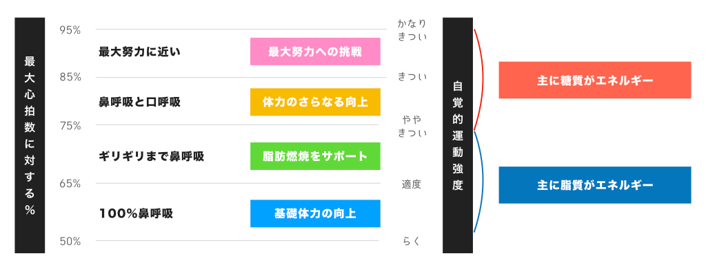 そこで私たちがおすすめするのは「ややきついと感じるくらいの運動強度」です。これぐらいの運動強度がいちばん脂肪燃焼効率が良いとされています。
