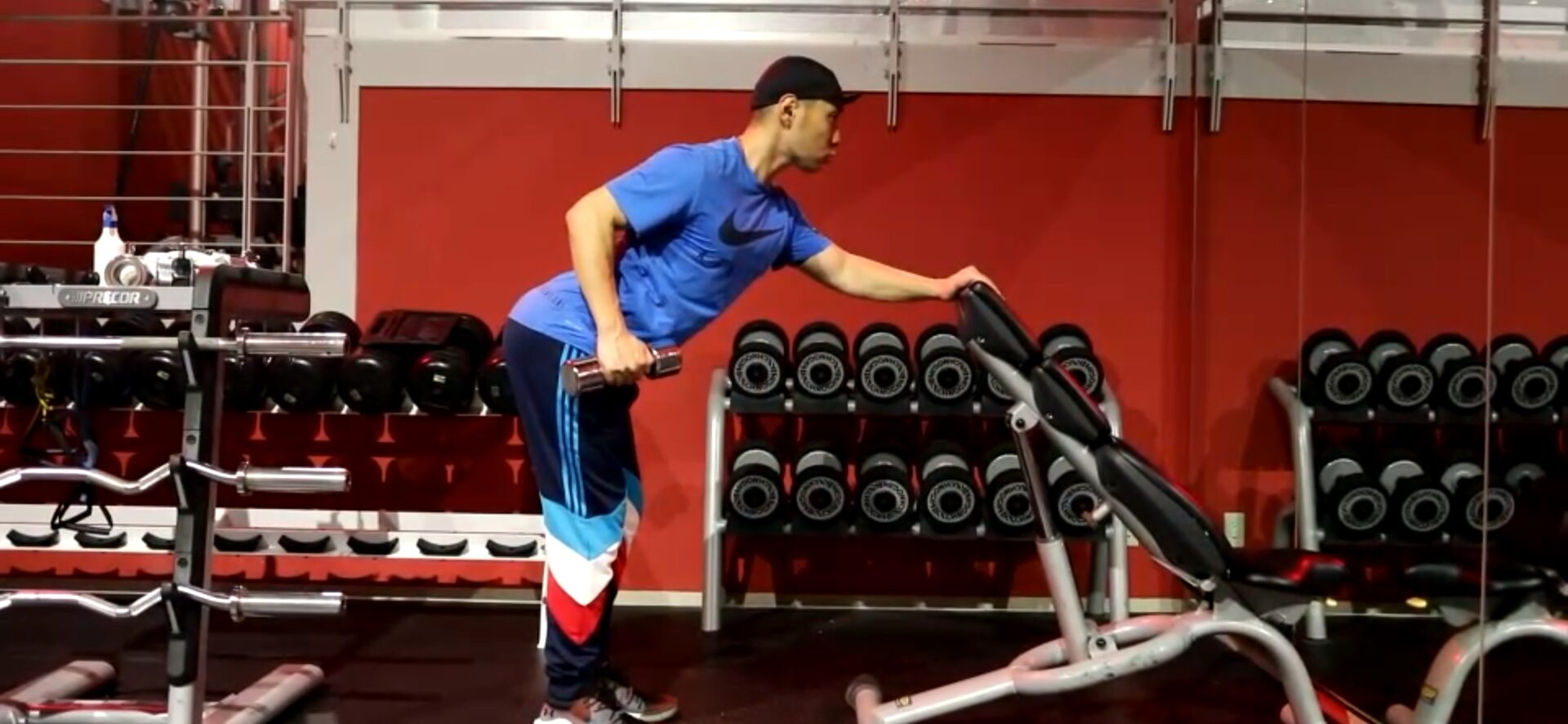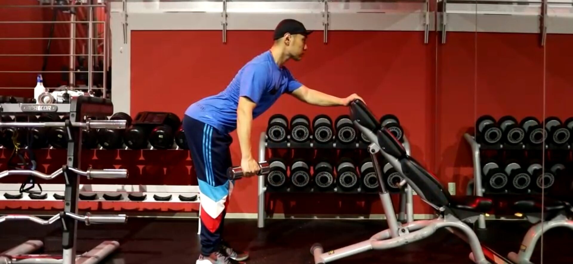 • ダンベルを引いた時に身体にぶつかってしまうのであれば、縦にして行いましょう。