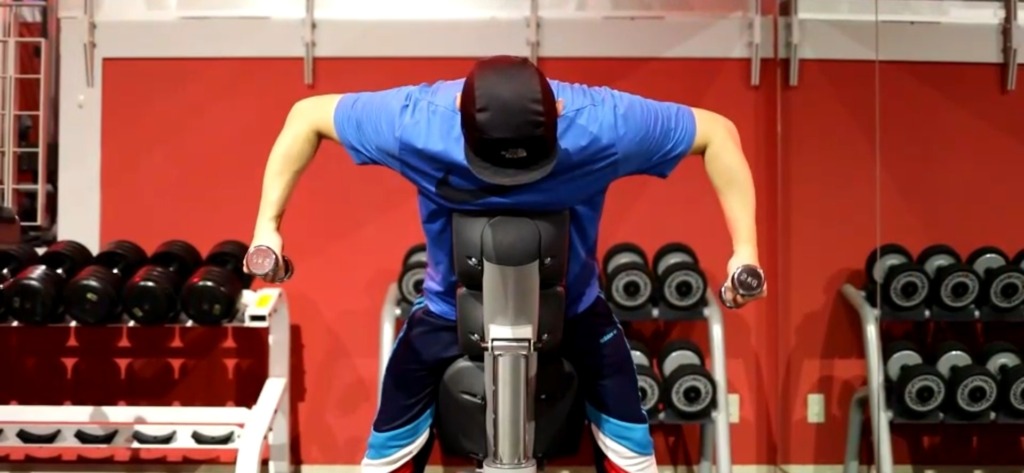 - スタートは横にダンベルを動かしていき、ある程度動かしたら肘を曲げながらダンベルを上に持ち上げるようにして行います(肩甲骨が動かない範囲で持ち上げる)