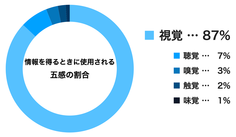 答えは「視覚」です。割合をみると視覚87%、聴覚7%、嗅覚3%、触覚2%、味覚1%とされています。つまり、人は多くの情報を視覚から得ているのです。